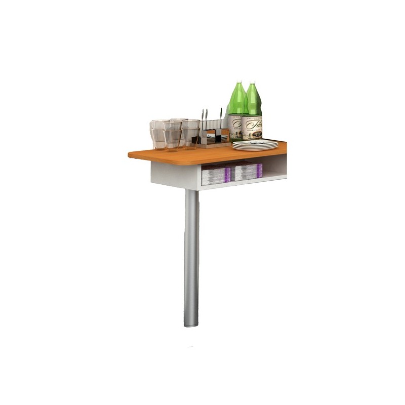 Angolo Ristoro: Set di mobili adatti ad arredare in modo efficacie una piccola zona caffè o ristoro all'interno di aziende, negozi, SPA ecc. In materiale bilaminato nobilitato melaminico conforme alle norme UNI EN classe E1. Antigraffio e antiriflesso. Allungo opzionale per mobile Punto Caffè (cod.82930); reversibile destro/sinistro con vano a giorno sotto al top. Piede d'appoggio costituito da un tubo metallico color alluminio. Bicolore bianco/noce chiaro. Dimensioni: 60x45cm - H84cm.