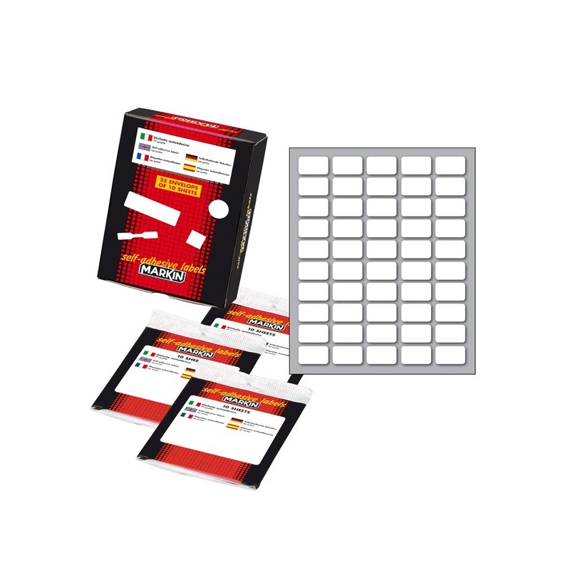 Busta da 10 fogli formato 125x152.5mm di etichette bianche permanenti. Ogni foglio contiene 50 etichette da 20x12mm.