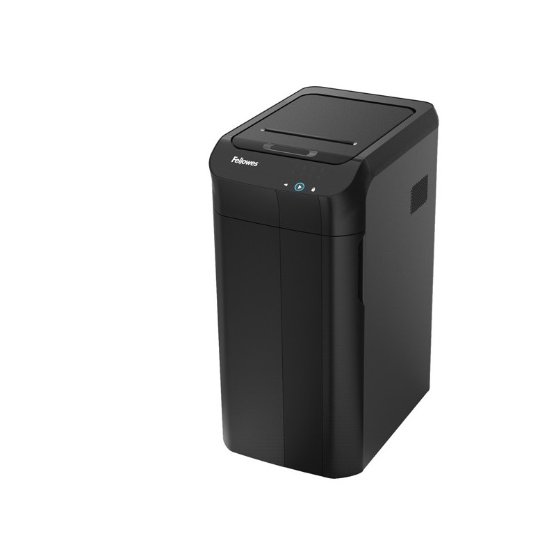 Distruggidocumenti taglio a frammento (4x38mm) ad alimentazione automatica per ufficio con uso condiviso grazie alla chiusura di sicurezza "Blocco Intelligente™" che blocca il cassetto durante il ciclo di distruzione, proteggendo le informazioni sensibili grazie ad un PIN a 4 cifre. Distruzione automatica fino a 550 fogli premendo il tasto di avvio. Oltre a CD/DVD e carte di credito (dalla fessura manuale), clip e punti metallici, può distruggere senza problemi anche carta spiegazzata, posta indesiderata, fogli stampati a colori su entrambi i lati, fascicoli spillati insieme (non importa dove si trovi il punto metallico) fino ad un massimo di 25 fogli. E' inoltre dotato di fessura per inserimento manuale 230mm (fino a 14 fogli). Velocità di taglio: 3,35MPM. Ciclo di lavoro: 45min on/30off. Capacità cestino 83 litri. Livello Din: P4. Livello DIN carte di credito: T4. Livello DIN CD: O-3. Dimensioni: 89x44,1x57,8cm. Peso 33,6Kg.