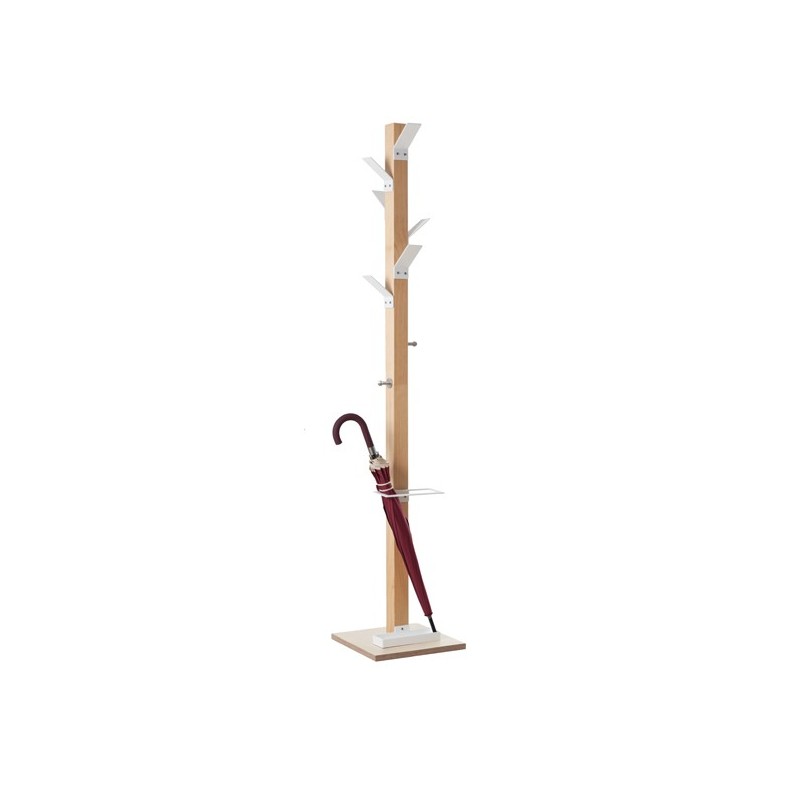 Appendiabiti in legno massello verniciato, sezione 60x60mm con 6 pomelli in polistirene resistenza agli urti e 2 pomelli in acciaio per borse, zaini ecc. Base in compensato marino verniciato 35x35cm spess. 20mm, su cui si trova la vaschetta di recupero gocce per il portaombrelli.