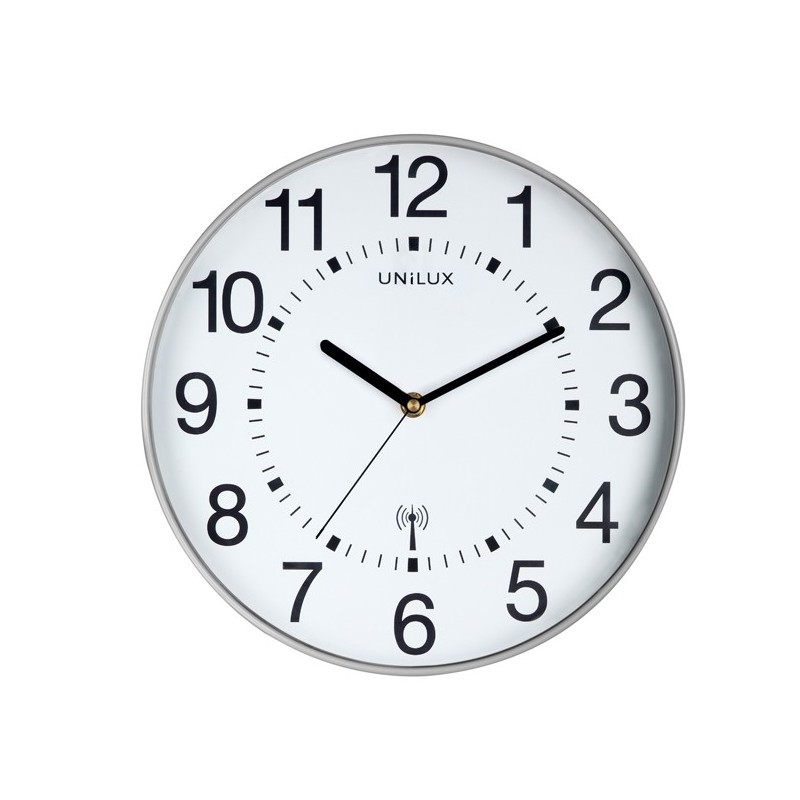 Orologio da parete con numeri grandi ben leggibili anche da lontano. Dotato di sistema di radiocontrollo con regolazione automatica dell'ora. Struttura in plastica con protezione in vetro; cornice tinta grigio metal. Non riceve in palazzi con strutture di metallo, in presenza di trasmettitori ad alta frequenza e a più di 1.500 km. dall’orologio atomico di Mainflingen. Alimentazione: 1 batteria AA 1,5V + 2 AAA (incluse). Made in China.