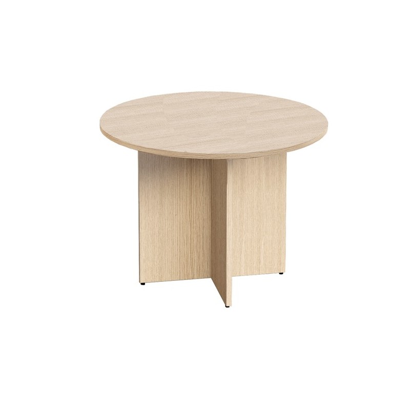 Tavolo riunione tondo Ø100 x H73cm (4 posti). In materiale melaminico classe E1 con finitura antigraffio e antiriflesso. Piani spessore 25mm gambe a croce e piedini regolabili in altezza.