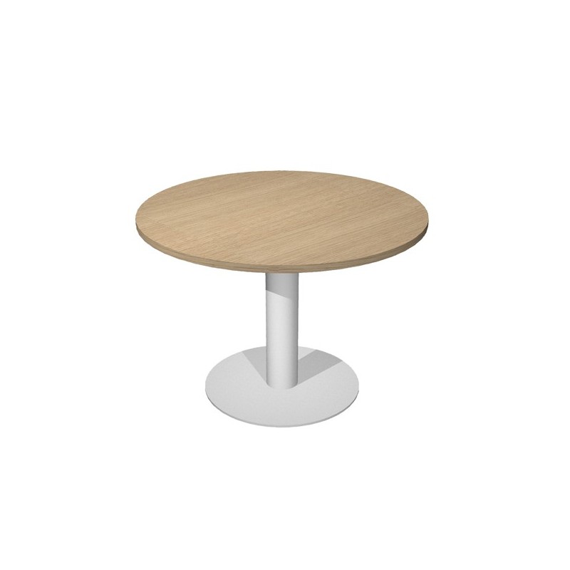 Tavolo riunione tondo Ø80 x H73cm (4 posti). In materiale melaminico classe E1 con finitura antigraffio e antiriflesso. Piani spessore 25mm gamba in metallo Ø8cm con base Ø50cm. Altezza fissa.