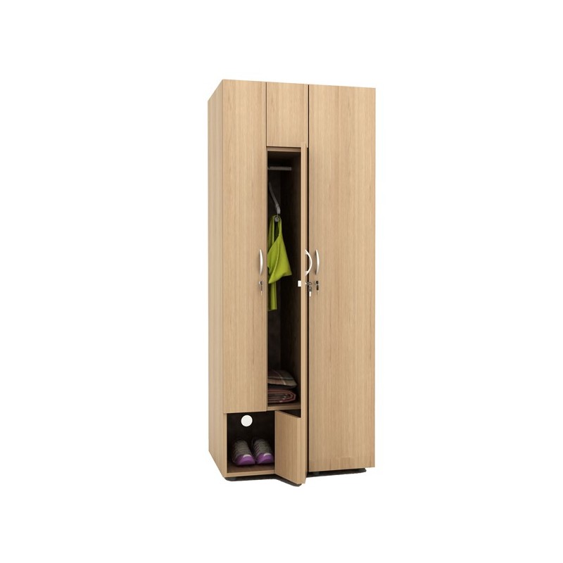 Mobile guardaroba/spogliatoio a 2 ante ognuna con serratura. In materiale melaminico classe E1 con finitura antigraffio e antiriflesso. Ogni anta chiude un vano piccolo (dimensioni utili: 36,4x48xH28cm) e un vano grande (dimensioni utili: 17,3x 48xH118,8cm) completo di asta appendiabiti. Dotato di fori per una perfetta aerazione posteriore e piedini regolabili in altezza. Le cerniere laterali sono provviste di un meccanismo scorrevole che permette l’apertura contemporanea del vano superiore con l'anta sinistra e del vano inferiore con l'anta destra.