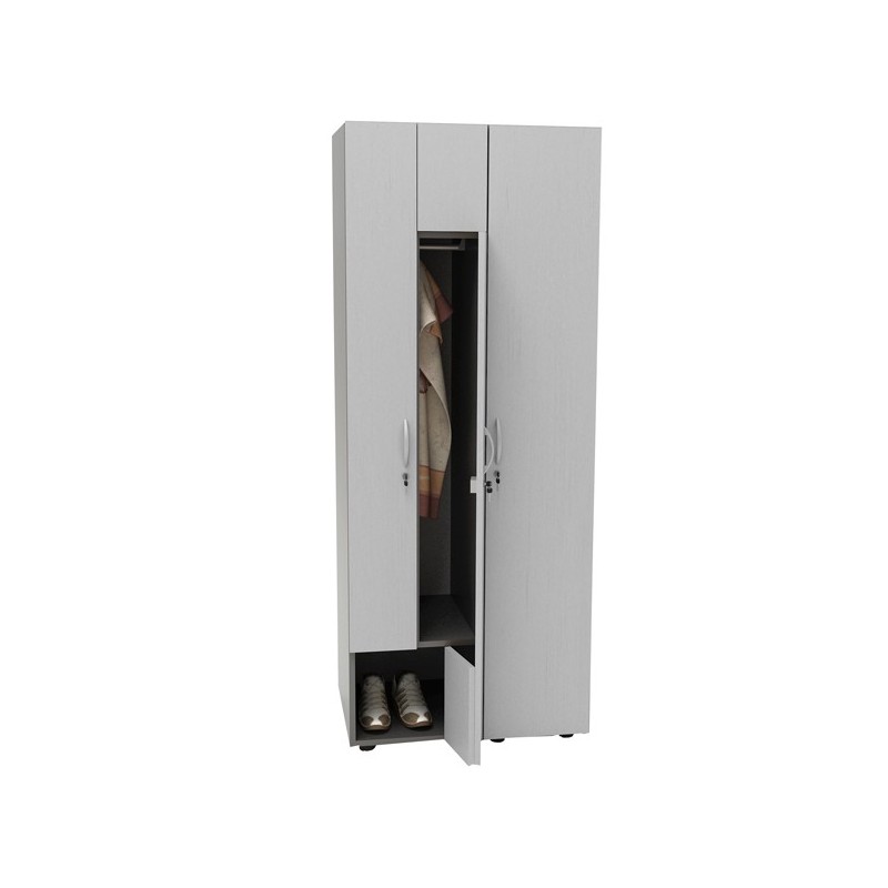 Mobile guardaroba/spogliatoio a 2 ante ognuna con serratura. In materiale melaminico classe E1 con finitura antigraffio e antiriflesso. Ogni anta chiude un vano piccolo (dimensioni utili: 36,4x48xH28cm) e un vano grande (dimensioni utili: 17,3x 48xH118,8cm) completo di asta appendiabiti. Dotato di fori per una perfetta aerazione posteriore e piedini regolabili in altezza. Le cerniere laterali sono provviste di un meccanismo scorrevole che permette l’apertura contemporanea del vano superiore con l'anta sinistra e del vano inferiore con l'anta destra.