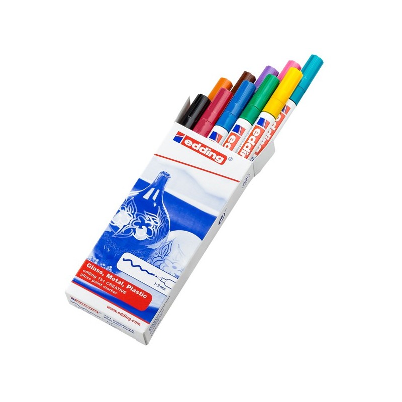 10 colori asssortiti. Marcatore a vernice coprente effetto smalto, permanente ed inodore. Privo di toluene/xilene. Resiste all’acqua, allo sfregamento, alle temperature fino a 400°C (bianco e argento fi no a 1000°). Aderisce a tutte le superfici lisce e porose: vetro, plastica, legno e metallo. Fusto in alluminio. Punta sintetica protetta da guaina metallica.
