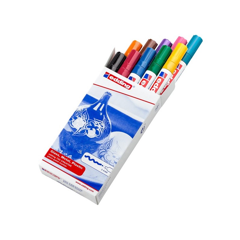 10 colori assortiti. Marcatore a vernice coprente effetto smalto, permanente ed inodore. Privo di toluene/xilene. Resiste all’acqua, allo sfregamento, alle temperature fino a 400°C (bianco e argento fi no a 1000°). Aderisce a tutte le superfici lisce e porose: vetro, plastica, legno e metallo. Fusto in alluminio. Punta sintetica protetta da guaina metallica.