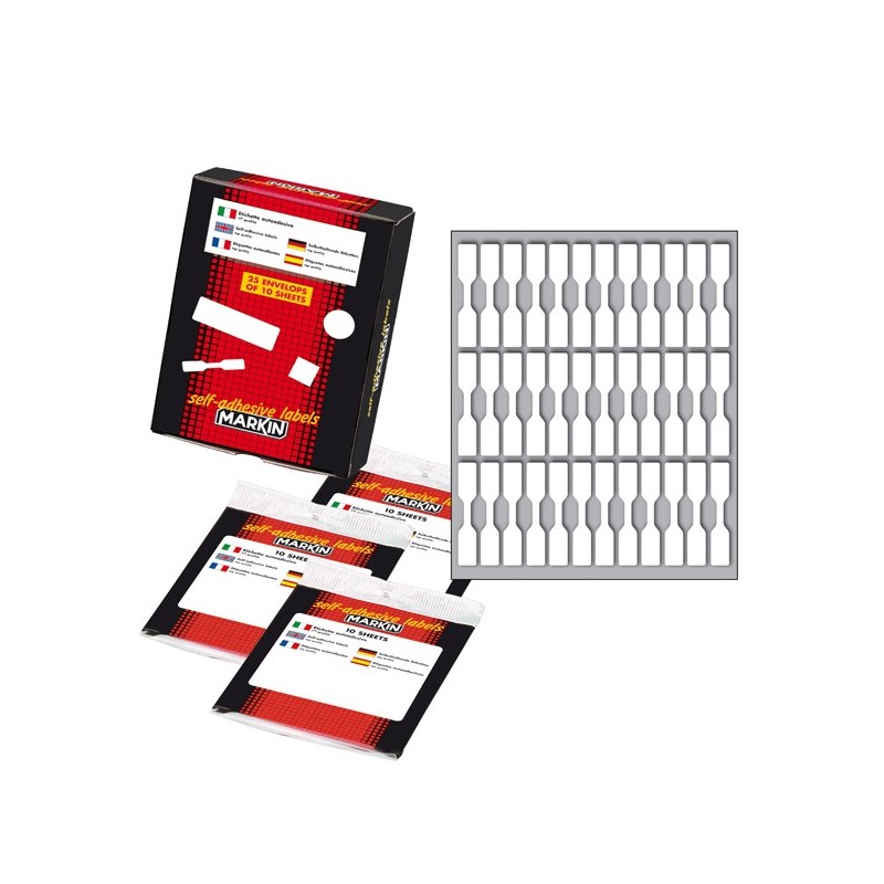 Busta da 10 fogli formato 125x152.5mm di etichette bianche permanenti. Ogni foglio contiene 36 etichette da 46x8mm.