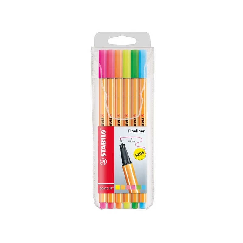 Astuccio 6 colori neon. Punta in feltro con rinforzo in metallo per garantire una grande resistenza. Cappuccio ventilato antisoffocamento. Lunga durata anche senza cappuccio. Ideale per lavori con riga , fotocopie e stancils. Tratto da 0,4mm.