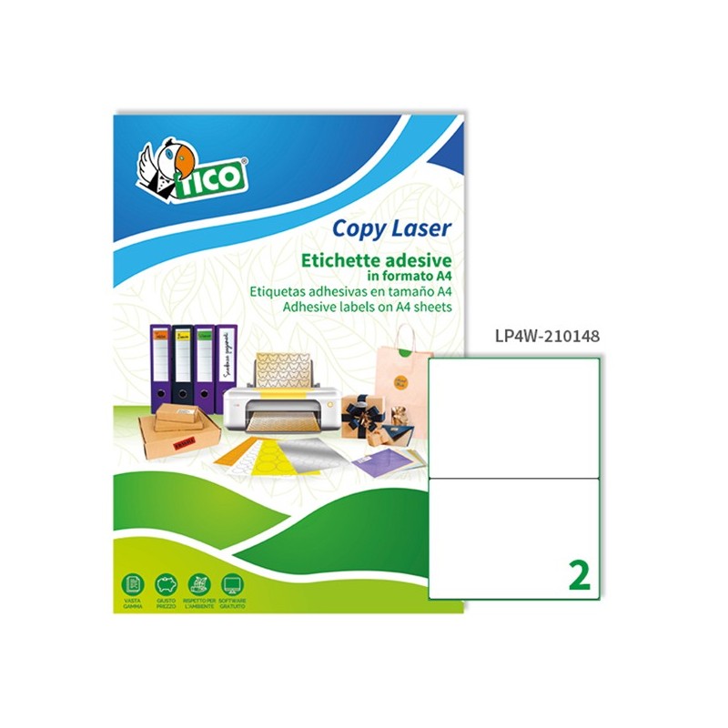 Etichetta adesiva LP4W - permanente - 210x148 mm - 2 etichette per foglio - bianco - Tico - conf. 100 fogli A4