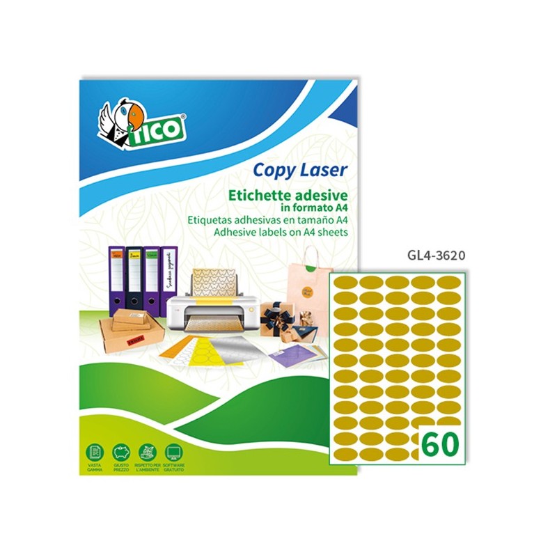 Scatola da 6000 etichette satinate oro ideali da utilizzare per decorare confezioni regalo come chiudi pacco, per personalizzare bomboniere e prodotti artigianali. Per stampe laser, tipografia e offset. Formato etichette 36x20mm. Scatola da 100 fogli (60 etichette per foglio). Confezione eco sostenibile in cartoncino prodotto in carta riciclata. Etichette prodotte con carta certificata FSC® proveniente da foreste gestite in maniera responsabile. Prodotte in Italia.