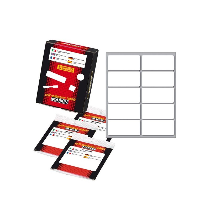 Busta da 10 fogli formato 125x152.5mm di etichette bianche permanenti. Ogni foglio contiene 10 etichette da 58x27mm.