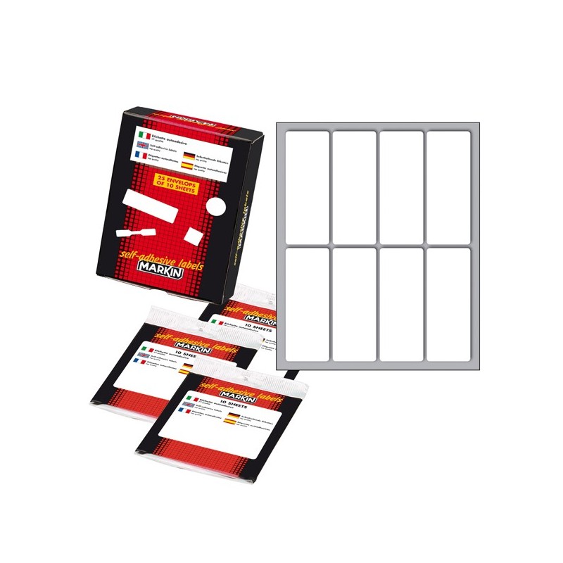 Busta da 10 fogli formato 125x152.5mm di etichette bianche permanenti. Ogni foglio contiene 8 etichette da 70x27mm.