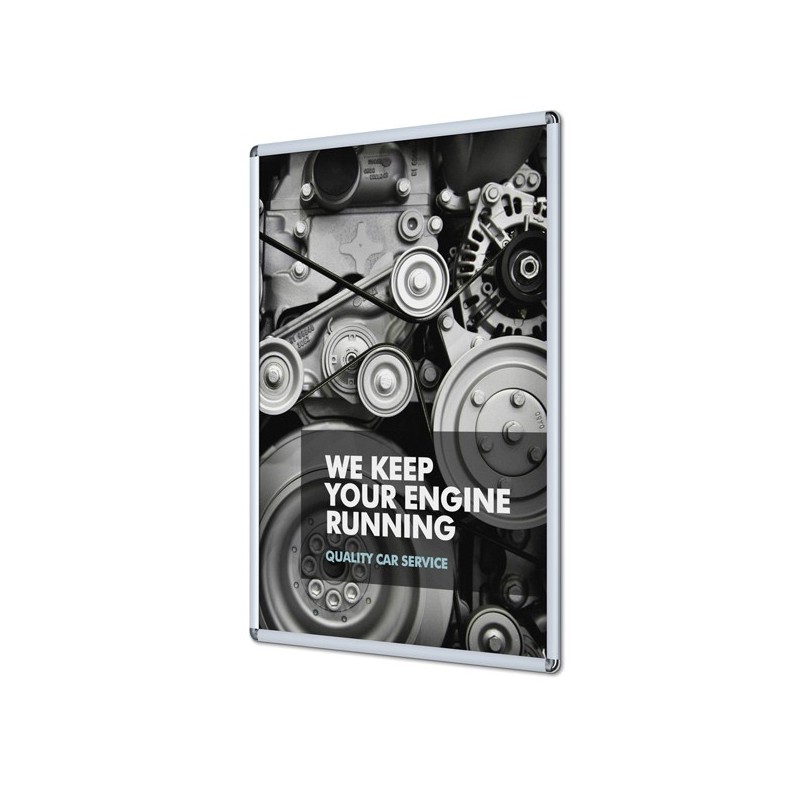 Cornici a scatto con angolo arrotondato e protezione antiriflesso in PVC. Fondo in materiale plastico PS. Tutte le cornici sono utilizzabili sia in orizzontale che verticale. Formato A4 (21x29,7cm) - profilo 25mm. Kit per fissaggio a muro non fornito.