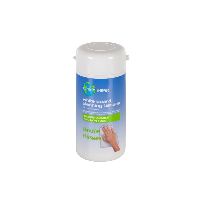 Contenitore apri&chiudi con 100 salviette di pulizia per lavagna bianca. Realizzate con prodotti riciclabili, imbevute con detergenti biodegradabili e non tossici