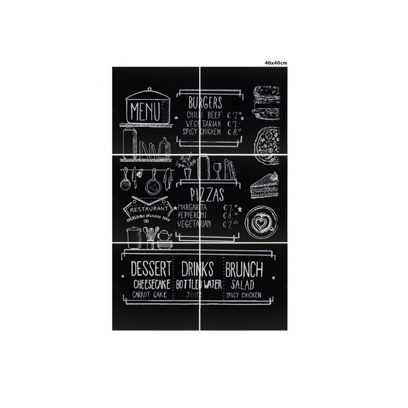 Kit composto da 6 lavagne 40x40cm per creare una lavagna XXL. Facili da pulire, resistente ai graffi, ai raggi UV, e agli urti. Utilizzabili con marcatori a gesso liquido. Adesivi per fissaggio a perete inclusi.