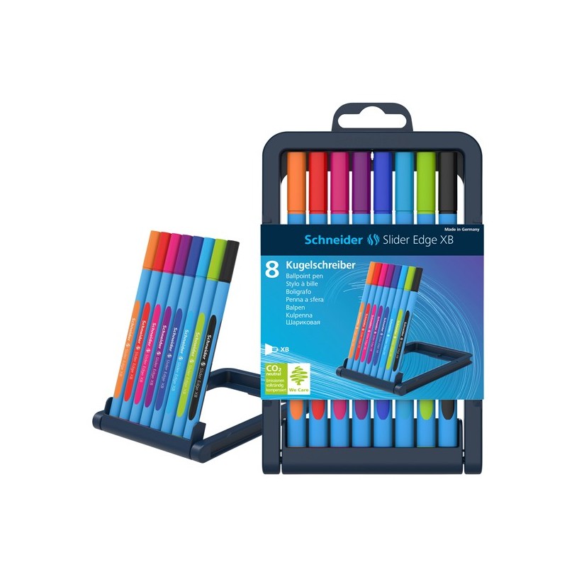 Astuccio con 8 penne a sfera dotate dell'innovativa tecnologia VISCOGLIDE. Penna a sfera Slider Edge con tecnologia Viscoglide®, inchiostro ultra scorrevole e asciugatura istantanea. Fusto gommato ergonomico, triangolare per una postura rilassata della mano.