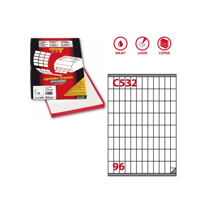 Scatola da 100 fogli di etichette in carta adesiva permanente in formato 21x29,7cm adatti per fotocopiatrici, stampanti laser, inkjet.
