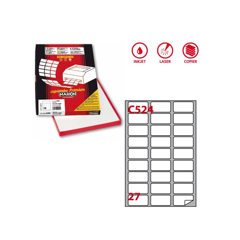 Scatola da 100 fogli di etichette in carta adesiva permanente in formato 21x29,7cm adatti per fotocopiatrici, stampanti laser, inkjet. Con angoli arrotondati.