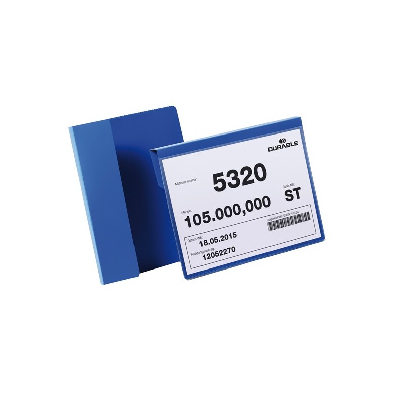 Buste identificative con aletta pieghevole, specificatamente progettate per l'identificazione di pallet e cartonati. Queste buste possono essere inserite tra i cartoni impilati o agganciate ai singoli pallet (la busta rimane appesa all'esterno del pallet o dei cartoni). Robuste e resistenti all'usura e agli strappi, sono realizzate con retro in plastica colore blu e copertina frontale trasparente in polipropilene. Adatte all'uso con scanner. Facile sostituzione dell'inserto. Proteggono da sporco e polvere i documenti inseriti. È possibile stampare inserti personalizzati utilizzando il software gratuito on-line DURAPRINT® sul sito www.duraprint.it. F.to Utile (LxH) 210x148mm (A5-oriz.). F.to Est. (LxH) 223x259mm. Dorso 22 mm, aletta 54mm.