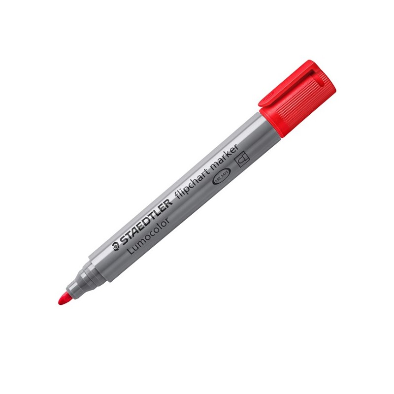 Marcatore con inchiostro a base d’acqua con punta sintetica per lavagne a fogli mobili. Non passa la carta. Inchiostro Dry Safe: non secca se lasciato senza cappuccio. Con clip. Punta tonda da 2mm. Colore: rosso.