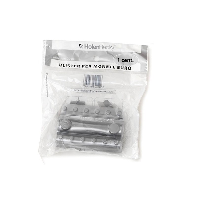Blister portamonete Euro in pvc riciclato 100% trasparente. Singolo blister colorato in modo differente per facilitare la distinzione tra i vari tagli di monete. Confezione da 20 blister per singola denominazione, in opp bag dotata di foro per espositore.