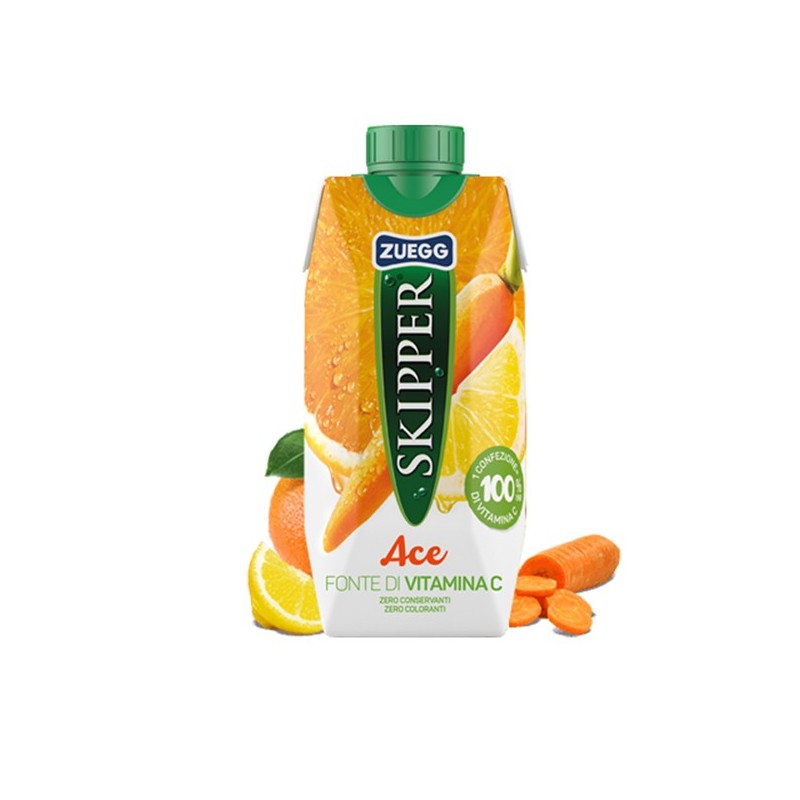 Succo Skipper gusto ACE BRICK 330ml Zuegg. Bevanda analcolica a base di succo di arancia, succo di carota, succo di limone, con vitamina C, vitamina E, vitamina A. Ingredienti: acqua, succo di arancia (21%), zucchero, succo di carota (5%), succo di limone (4%), aroma naturale, vitamina C, vitamina E, vitamina A. SENZA GLUTINE.