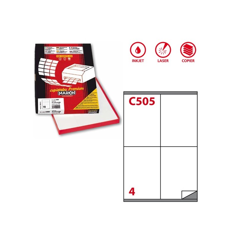Scatola da 100 fogli di etichette in carta adesiva permanente in formato 21x29,7cm adatti per fotocopiatrici, stampanti laser, inkjet.