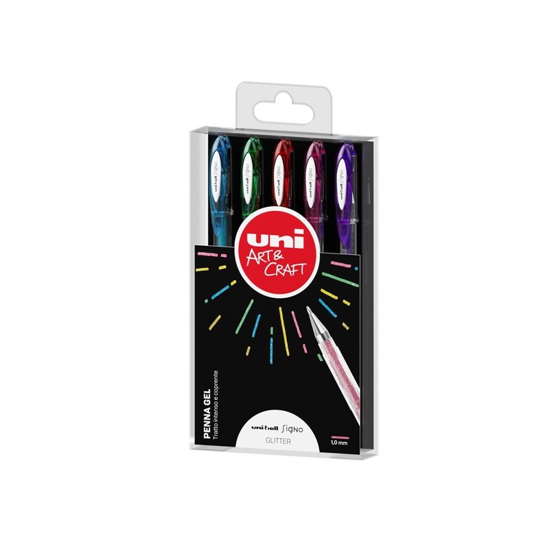 Astuccio 5 colori glitter. Penna inchiostro gel resistente alla luce e all'acqua. Lunga durata e asciugatura rapida. La puntina "anti-graffio" assicura massima scorrevolezza. Ideale per prendere appunti, disegnare e decorare.
