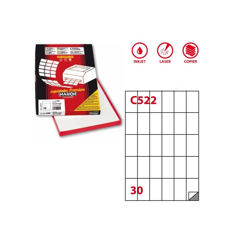 Scatola da 100 fogli di etichette in carta adesiva permanente in formato 21x29,7cm adatti per fotocopiatrici, stampanti laser, inkjet.