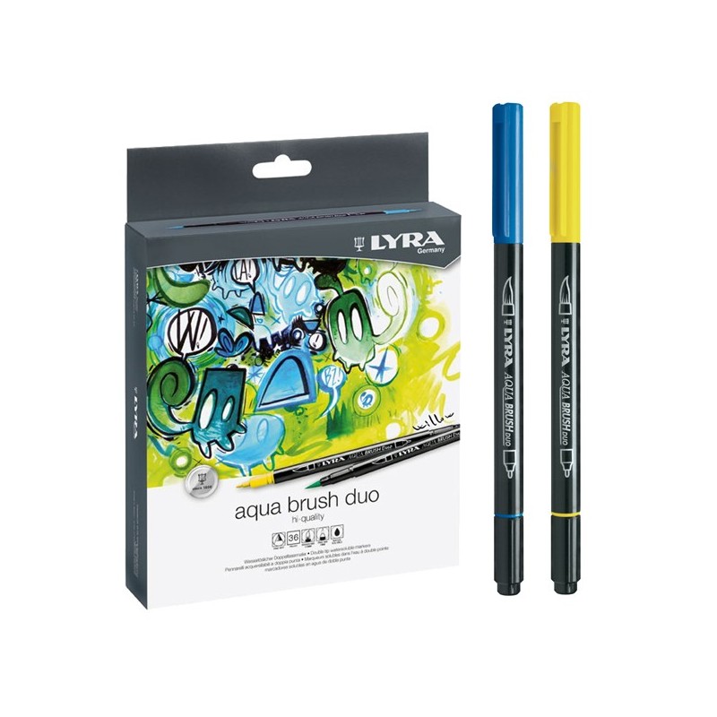 Confezione 36 pennarelli a due punte di ottima qualità. Punta fine per disegni di precisione, contorni e dettagli. La punta pennello permette invece una pennellata piatta, morbida e pulita. Colori a base acqua perfettamente acquerellabili.