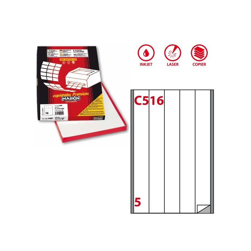 Scatola da 100 fogli di etichette in carta adesiva permanente in formato 21x29,7cm adatti per fotocopiatrici, stampanti laser, inkjet.