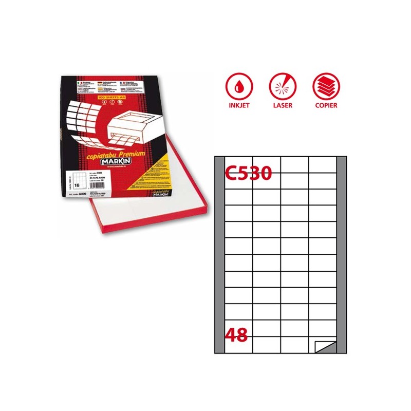 Scatola da 100 fogli di etichette in carta adesiva permanente in formato 21x29,7cm adatti per fotocopiatrici, stampanti laser, inkjet.