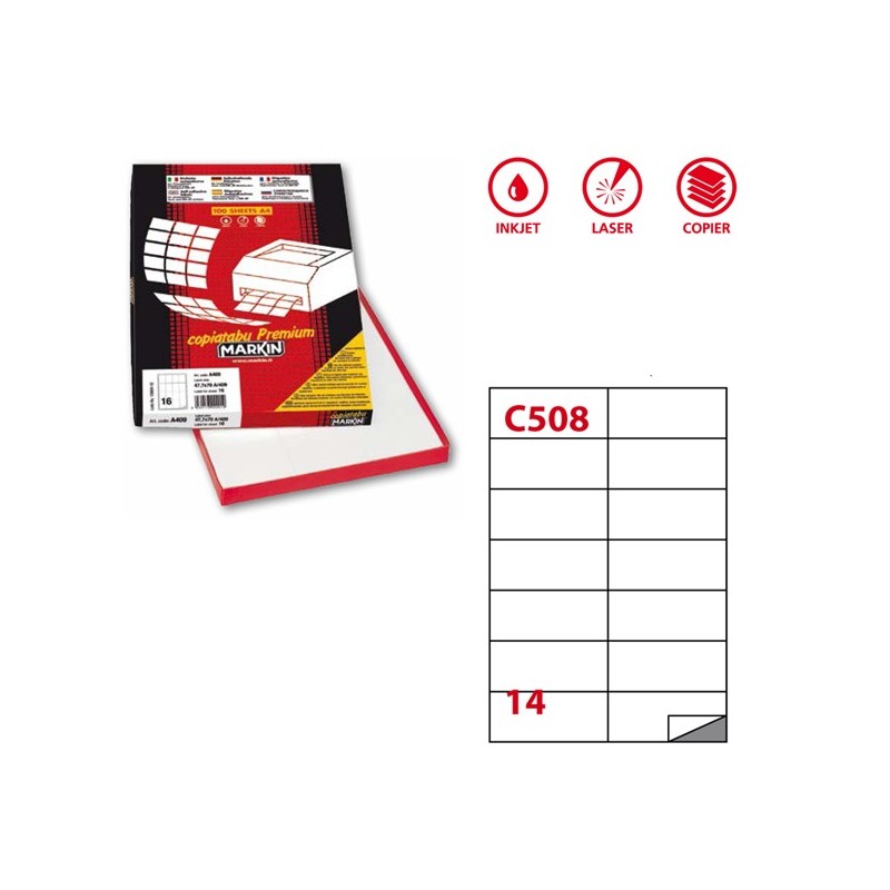 Scatola da 100 fogli di etichette in carta adesiva permanente in formato 21x29,7cm adatti per fotocopiatrici, stampanti laser, inkjet.