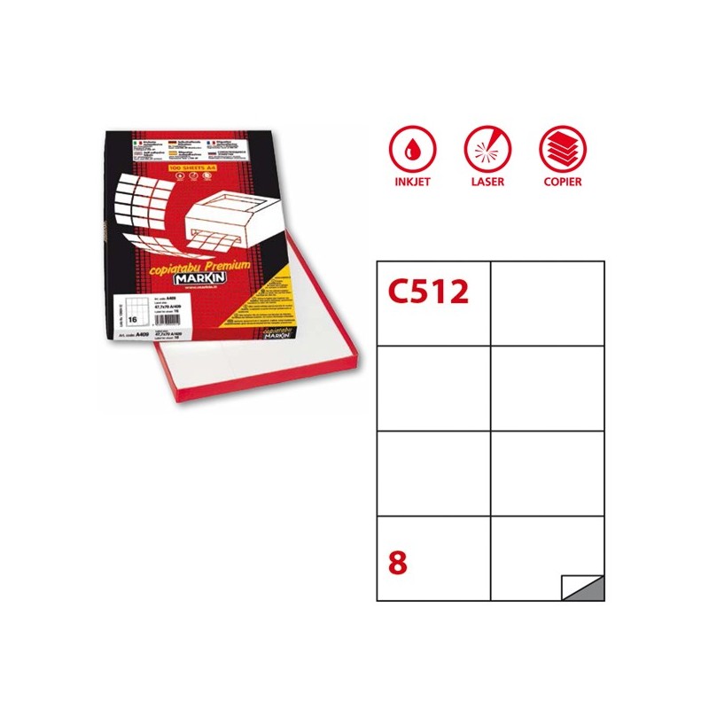Scatola da 100 fogli di etichette in carta adesiva permanente in formato 21x29,7cm adatti per fotocopiatrici, stampanti laser, inkjet.