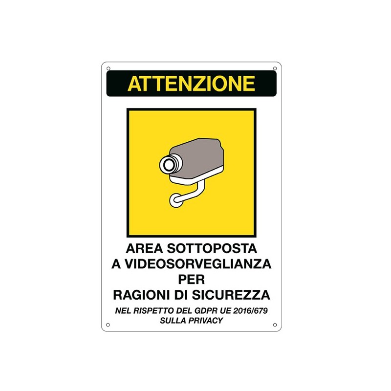 Cartello alluminio con dicitura: 'Area sottoposta a videosorveglianza'. Rif.Art. 13 del regolamento generale in materia di protezione dei dati personali (UE 2016/679)