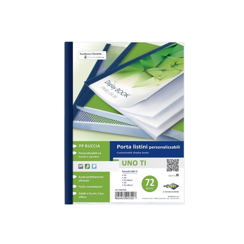 Porta listini a 72 buste in PP buccia arancia, con copertina e retro personalizzabili. Dorso blu. Il perfetto allineamento delle buste e la particolare saldatura facilitano la consultazione. Formato contenuto 220x300mm.