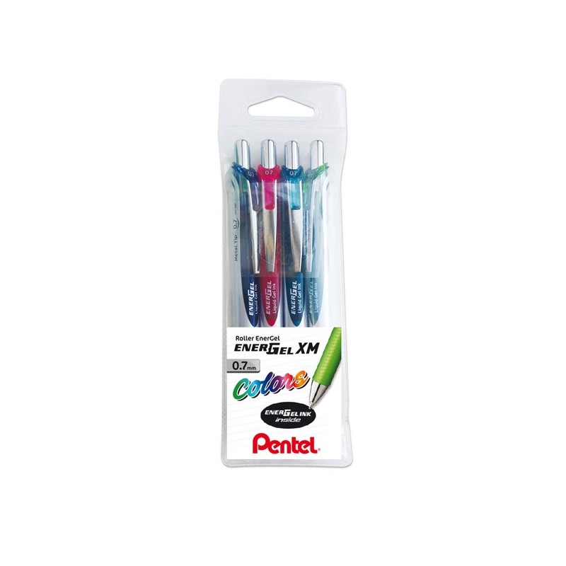Roller EnerGel XM a scatto 0,7 mm con inchiostro colorato. Design elegante con clip e puntale in metallo. Grip in gomma nel colore di scrittura. Massima precisione nel tratto. Ricaricabile con refill LR7. Astuccio 4 colori: rosso, blu, verde e nero.