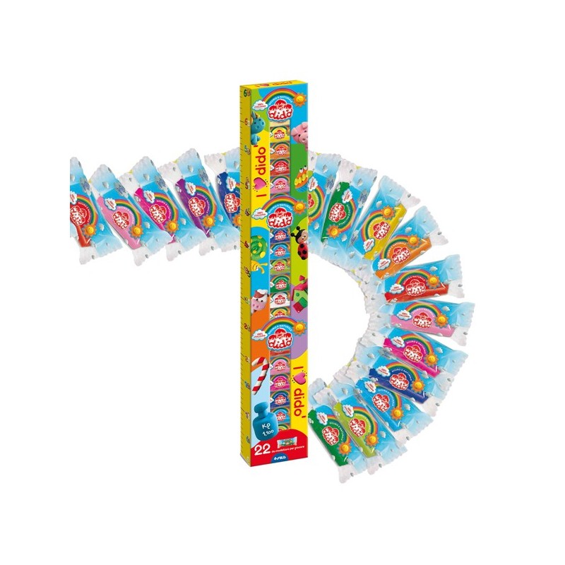 1 Kg e 100g DI PASTA MADE IN ITALY! L’unica confezione con tutta la gamma cromatica di Didò per un regalo fuori misura! Una confezione così non si era mai vista prima! I bambini amano Didò, e Didò vuole premiare i suoi piccoli fan con un super-pack: 22 salsicciotti da 50g, coloratissimi, in versione basic e con glitter.