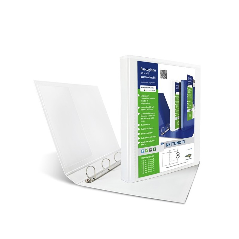 Raccoglitori personalizzabili in Stratopan (cartone interamente rivestito in PP) con meccanismi a 4 anelli a D. Dotati di tasche trasparenti sul 1° quadrante e sul dorso. Tasca interna. Inserimento facilitato della personalizzazione del dorso.