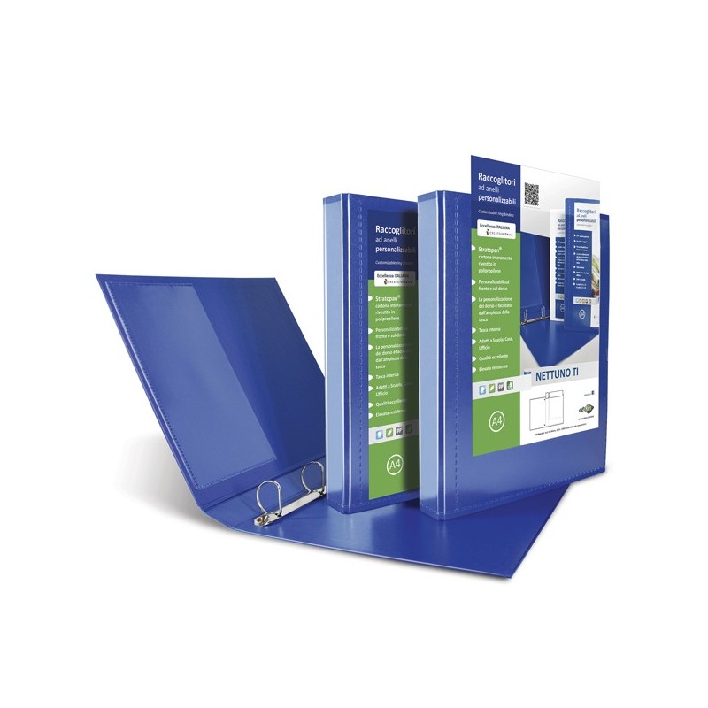 Raccoglitori personalizzabili in Stratopan (cartone interamente rivestito in PP) con meccanismi a 4 anelli a D. Dotati di tasche trasparenti sul 1° quadrante e sul dorso. Tasca interna. Inserimento facilitato della personalizzazione del dorso.