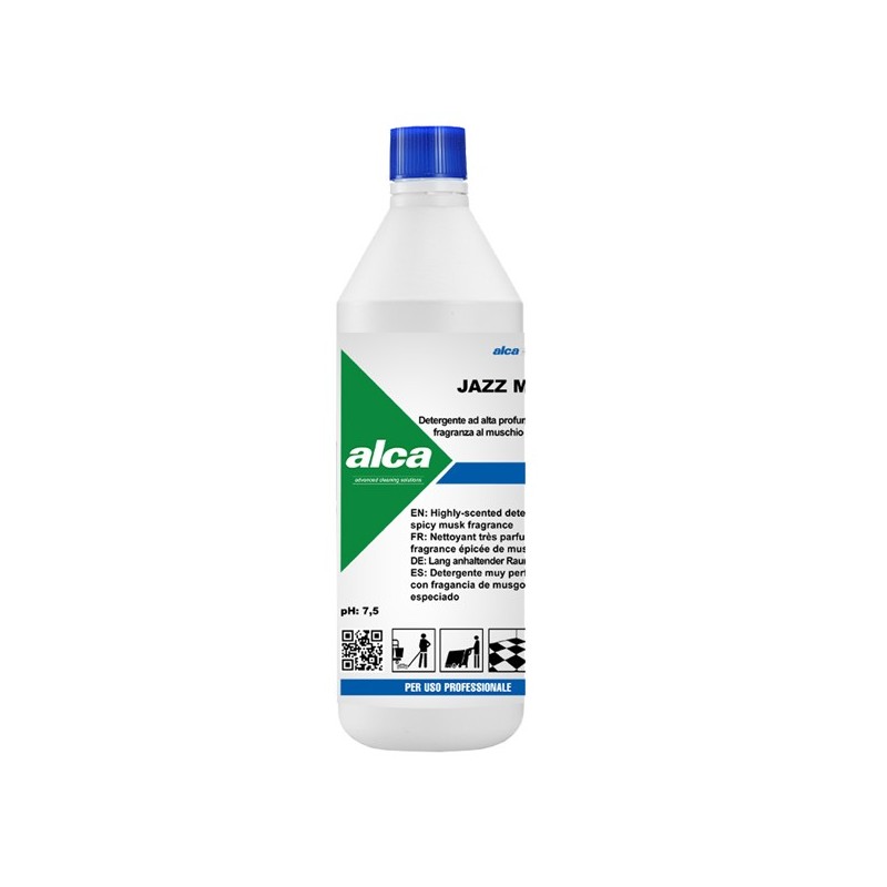 JAZZ NORAH - Detergente ad alta profumazione con fragranza al muschio speziato. Miscela neutra (pH 7,5) ad alto tenore di profumo con agenti sinergici in base acquosa adatta a lasciare un’atmosfera gradevole nell’ambiente in cui si è lavorato. Consigliata per luoghi chiusi soggetti a passaggio frequente di persone. Adatta per le pulizie di manutenzione di tutte le superfici lavabili. Prodotto poco schiumoso, adatto all’uso sia manuale che a macchina senza risciacquo, lascia le superfici brillanti e profumate, senza residui nè aloni. In flacone da 1 litro.