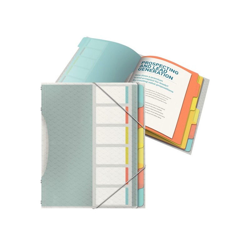 Cartella a 3 lembi sulla copertina posteriore e chiusura a elastico per una maggiore sicurezza del contenuto. La nuova finitura con motivi in rilievo la rende piacevole al tatto. Include un indice removibile sulla copertina anteriore. Disponibile nella versiona da 6 e 12 divisori nei colori Colour'Ice assortiti.