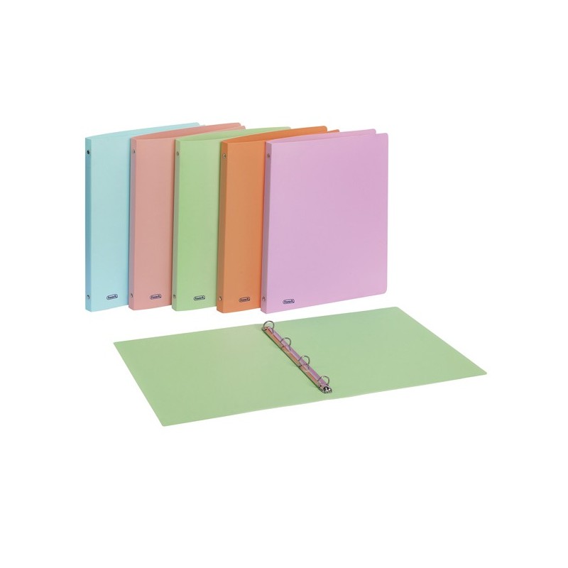 Realizzati in polipropilene opaco dai colori pastello con copertina flessibile. Disponibili in 5 colori: celeste, cipria, smeraldo, pesca e glicine. Formato interno 22x30 cm. Disponibili con meccanismo a 4 anelli tondi con Ø15mm e Ø30 mm. Made in Italy.