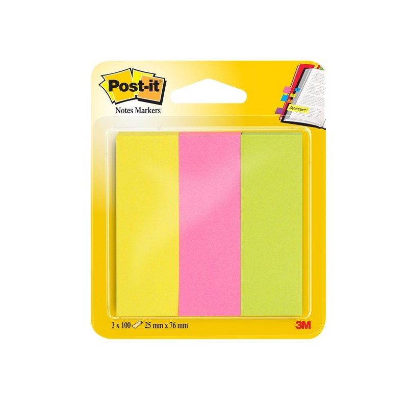 Segnapagina in carta, autoadesivi, scrivibili e riposizionabili. Formato 25x76mm. 100 fogli in tre colori assortiti: giallo, rosa, verde. Confezione da 300fogli.
