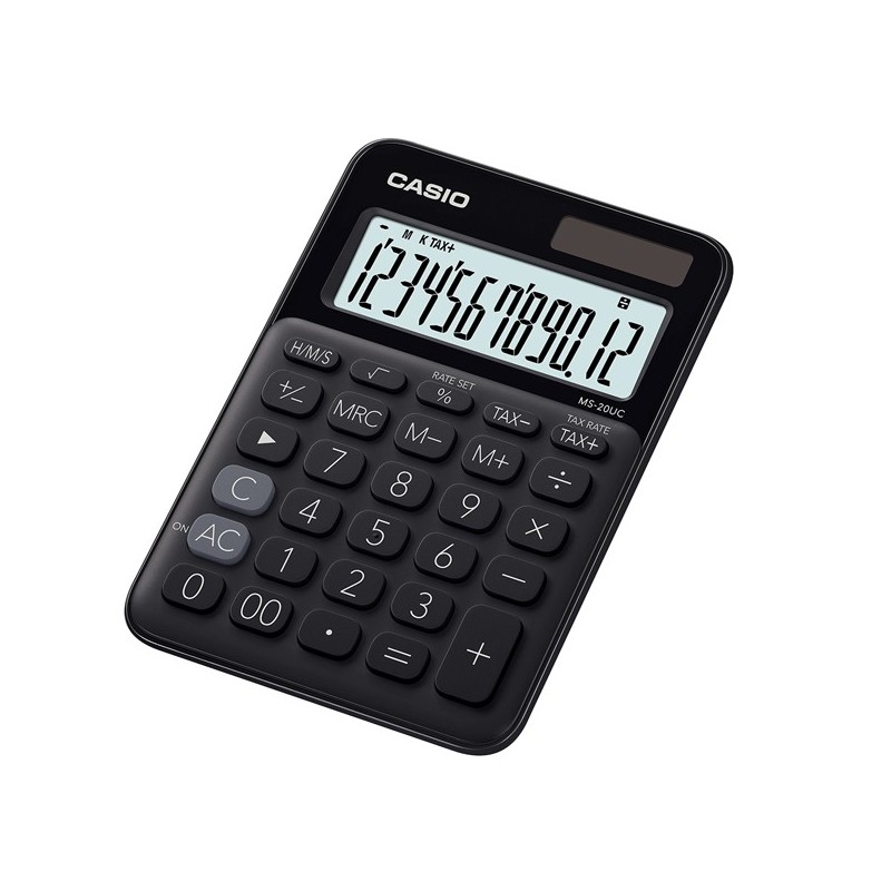 Grande display a 12 cifre. Doppia alimentazione, solare e a batteria (1 x LR1130). Tasti in plastica. Key Rollover. Funzioni: calcolo percentuale, calcolo tempo, conversione valute (3 Memorie), calcolo delle imposte, 3 tasti di memoria, 3 cifre dopo la virgola, tasto cambio segno +/-, tasto correzione veloce, radice quadrata, tasto doppio zero. · Dimensioni (PxLxA): 2,3x10,5x14,95cm. Peso: 110 g. circa.