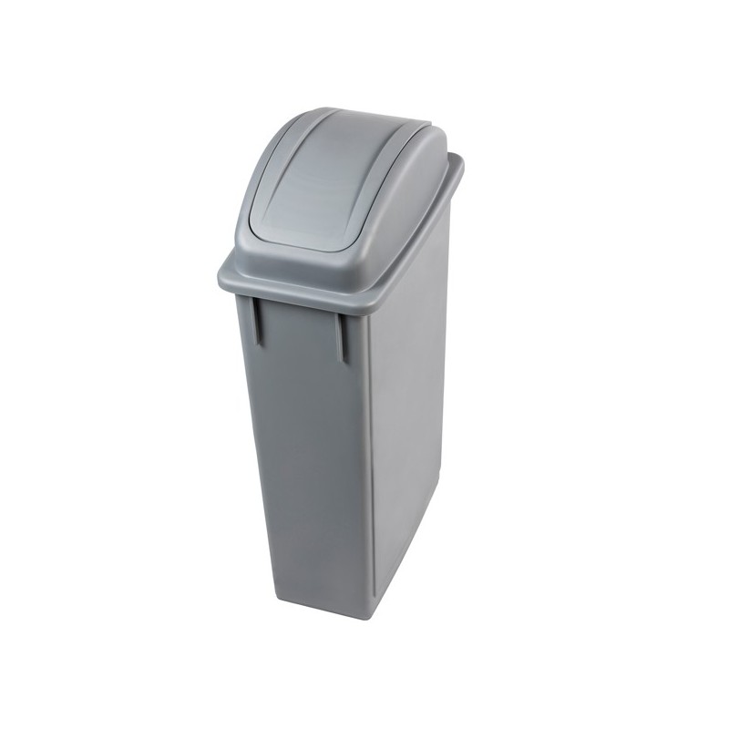 Contenitori per raccolta differenziata in polipropilene. Robusto secchio da 90 litri con coperchio in polipropilene colore grigio apertura basculante per la raccolta dei rifiuti indifferenziati. Design compatto per un facile collocamento in spazi ridotti. Dimensioni: L29,5 x P52 x H93cm. Pulizia periodica da effettuare con un panno morbido e non abrasivo, imbevuto d’acqua. Detergenti che contengono solventi possono danneggiare il materiale.