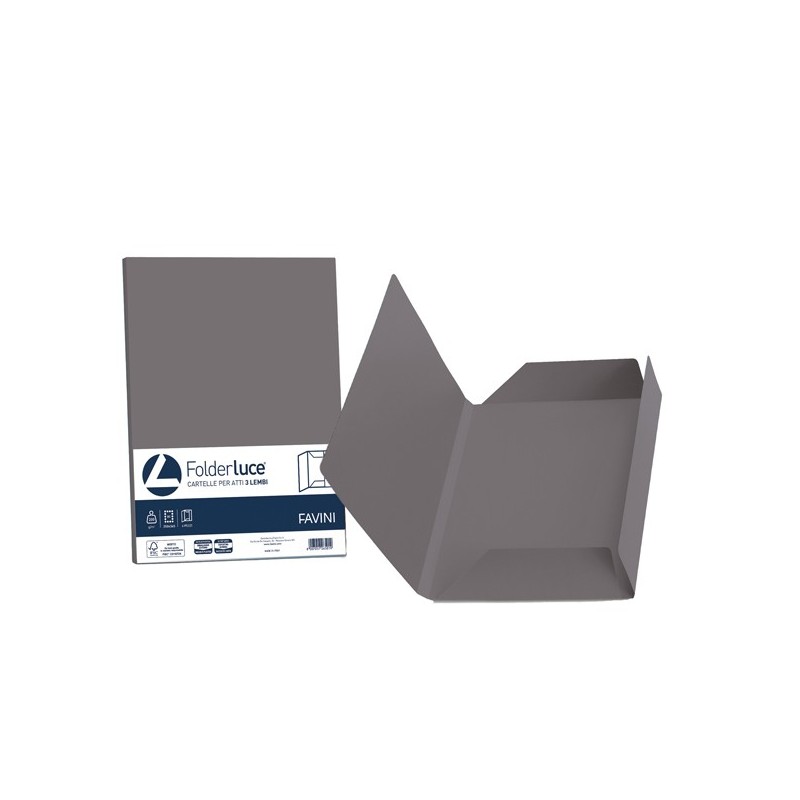 Cartellina a tre lembi in cartoncino bristol da 200gr liscio su ambo i lati. Il fondo dei tre lati presenta lembi fustellati e ripiegati. Formato 245x345mm.