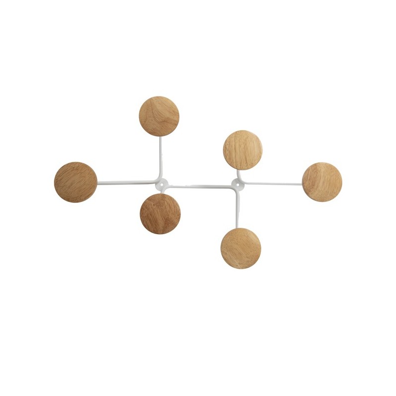 Appendiabiti dal design retrò con un tocco contemporaneo. In metallo verniciato di colore bianco. Grande capacità con 6 pomelli in legno da 9cm. Capacità: 5kg per pomello.