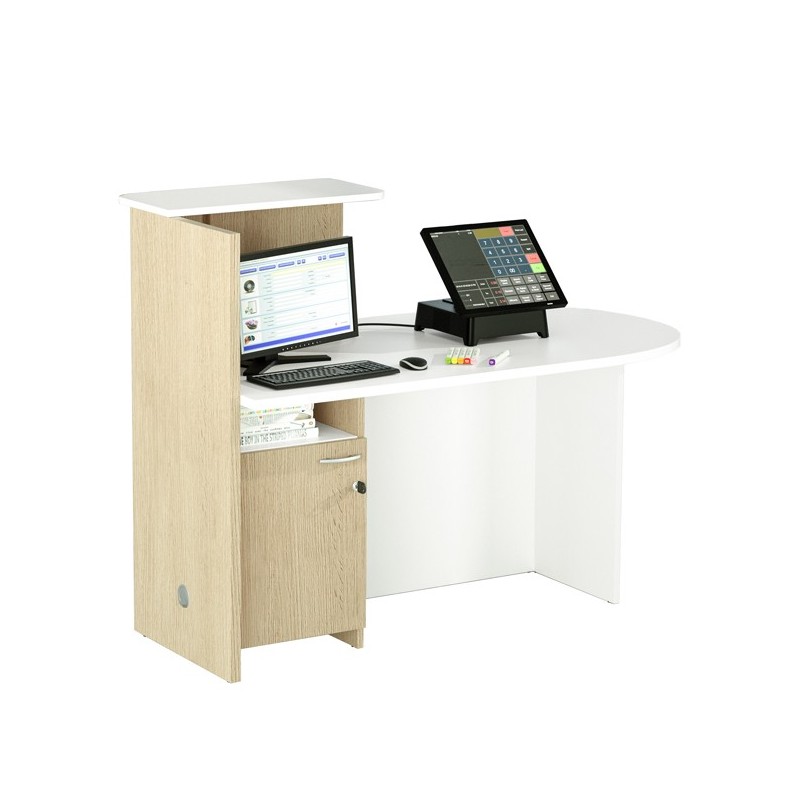 Reception ideale come postazione cassa in negozi, centri estetici ecc. o come reception in ambulatori, cliniche e ovunque sia necessaria una postazione di ricevimento confortevole ma compatta. Dotata di bancone con piano sagomato a DESTRA 140x83xH73,3cm (sp. 25 mm). Mensola superiore 64x30cm sp. 18mm (H42cm dal piano). Due ripiani L38,2cm sotto il desktop. Fianco (sp. 25mm) con foro passacavi in corrispondenza del ripiano inferiore. Bicolore bianco/rovere.